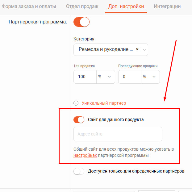 Как добавить ссылку на сайт с рекламой продукта, чтобы мои партнеры рекламировали ссылку на сайт, а не на форму заказа?